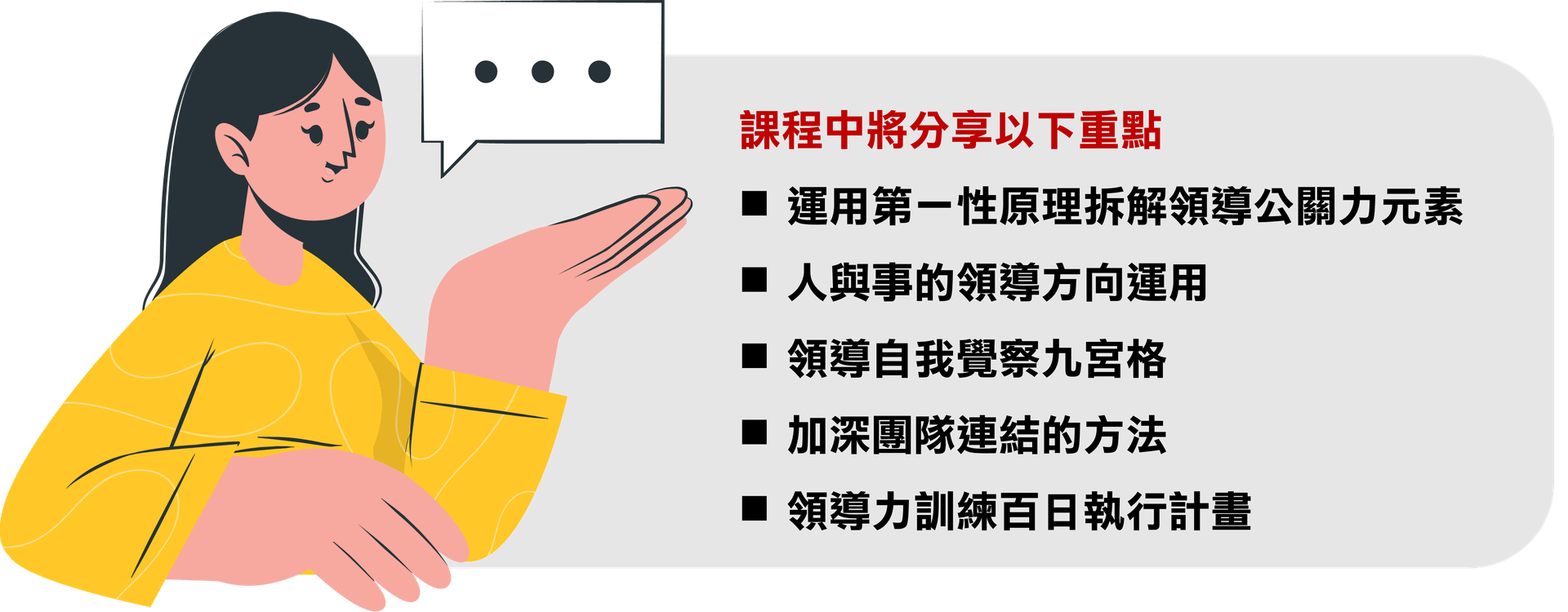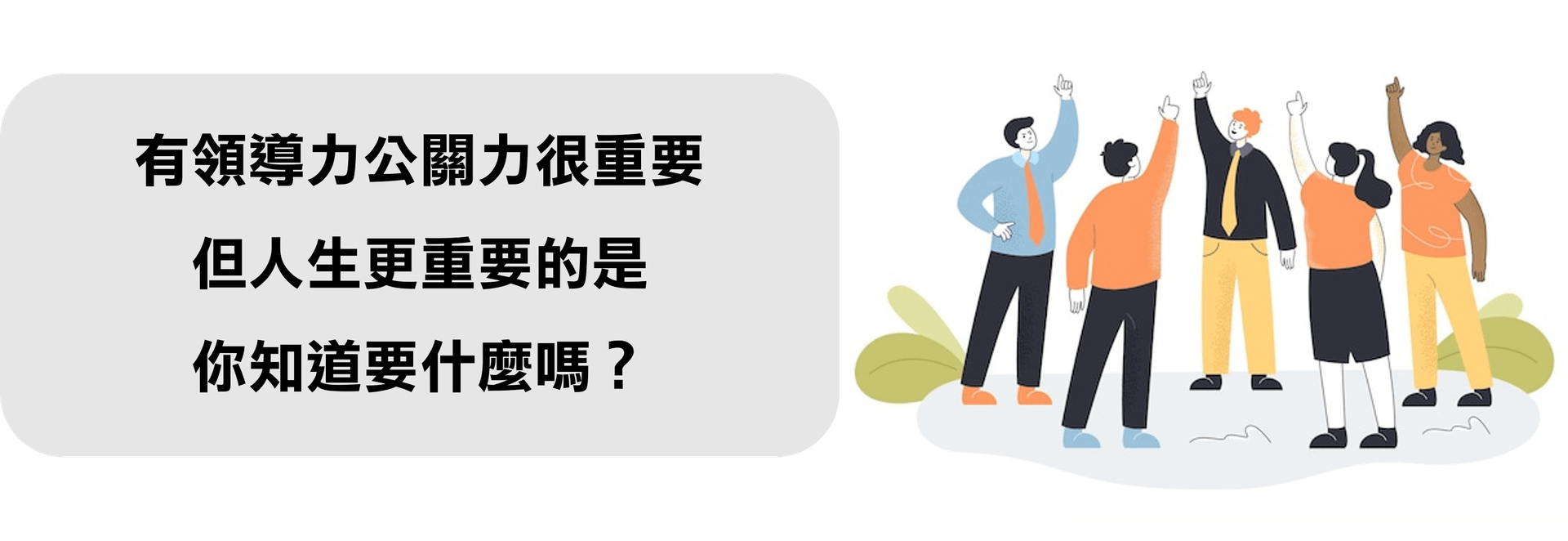「領導者」總給人位高權重的感覺,但你不需要走到高位才開始培養 訓練領導力可以幫助你在現階段:發揮溝通協調的本事,影響周圍夥伴,讓大家心甘情願為同個目標努力!