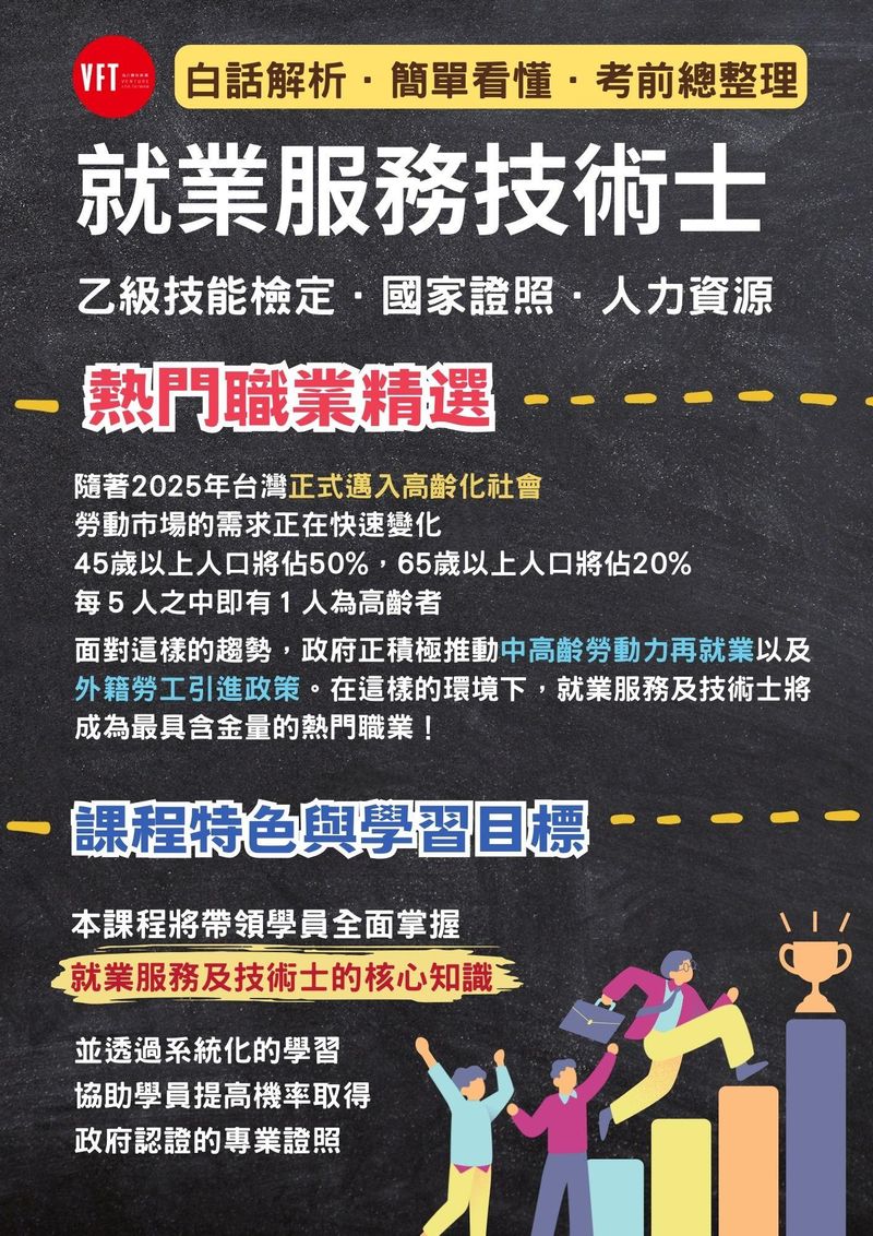 隨著台灣正式邁入高齡化社會,政府積極推動中高齡勞動力再就業與外籍勞工政策,專業的「就業服務技術士」成為最搶手的職業證照之一!現在,就是你掌握趨勢、取得證照的最佳時機!